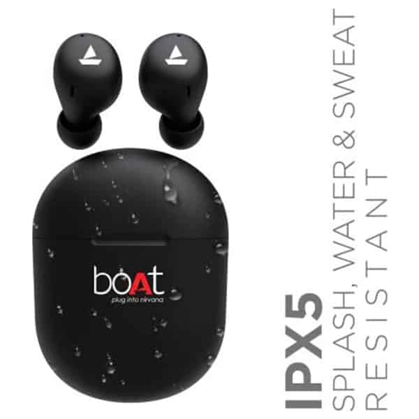 - boAt Airdopes 383: Tune into Nirvana with boAt Airdopes 383 TWS earbuds to enjoy your music in a truly wireless way. The TWS Airdopes 383 come equipped with 7mm rhythmic dynamic drivers for immersive, HD sound. The latest Bluetooth v5.0 offers seamless instant connectivity. With a battery capacity of 50mAh for each earbud, indulge in blissful audio experience for up to 4 hours in a go. It is IPX5 rated to offer resistance against sweat and water scares. The ergonomically designed TWS Airdopes 383 are truly in ear wireless earbuds dope.