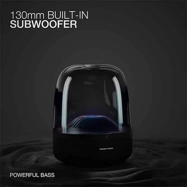 Style and substance. Harman Kardon Aura Studio 3 speakers emit exceptional 360 degree audio. Enjoy more dynamic sound thanks to a powerful subwoofer for a truly immersive listening experience.➦ Premium Materials