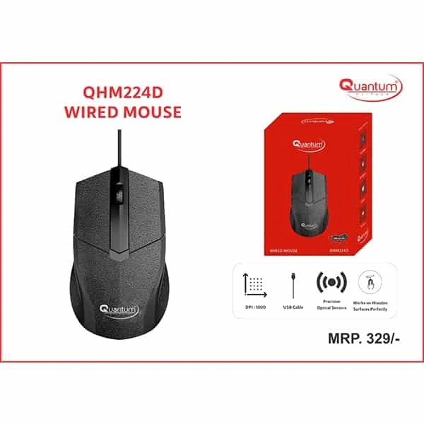 - Quantum QHM 224d Wired Optical Mouse provides you USB Connection and has precision optical sensors which make it a highly compatible device for your desktop and laptops. It works smoothly on wooden surfaces.
