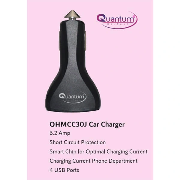 - Fast charge with QHMCC30J Car Charger. It has 4 USB Ports. This charger supports 6.2A of current and gives protection against short-circuiting. It has a small chip for optimal current charging
