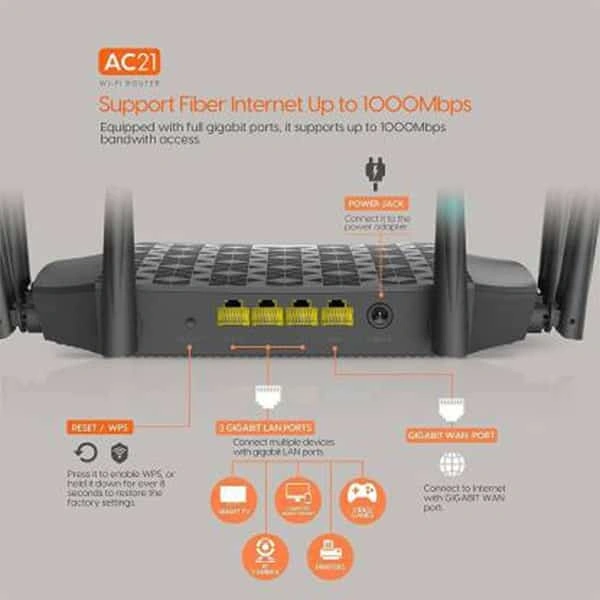 AC21 is a dual band gigabit wireless router specially designed for households with high speed internet access. It supports 802.11ac wave2 techonology and provides WiFi speed up to 2033Mbps (2.4 GHz: 300Mbps, 5GHz: 1733Mbps) to achieve the best performance for your fiber internet connection. Powered by 4X4 MU-MIMO technology of 5GHz band, it provides wider WiFi coverage and faster WiFi speed than regular routers with 3X3 MU-MIMO technology. Equipped with full gigabit ports, it supports up to 1000Mbps bandwith access. The 28nm 1GHz CPU equipped with 500MHz co-processor, dual-core design brings a faster processing speed and provides optimized operation. Featured with 6*6dBi external antennas , AC21 outshines in performance and wall penetration capacity.Specifications