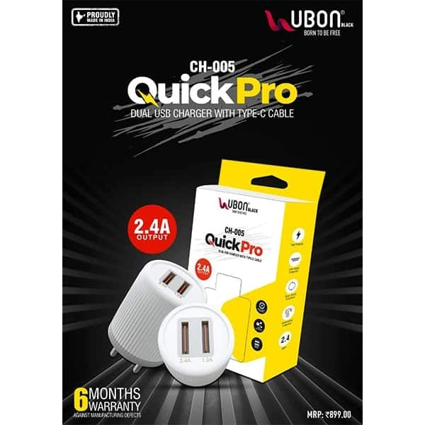 Ubon CH 005 2.4A Fast Charging Dual USB Port Wall Adapter with Type – C cable