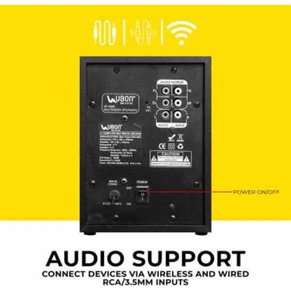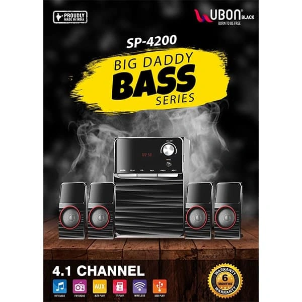 MADE IN INDIA: UBON presents a proudly Made in India home theatre SP-4200 Big Bass 2.0 with Disco Lights. 4.1 MULTIMEDIA SPEAKER: SP-4200 is a 40 watt multimedia speaker. The speaker set comes with one 4 inch subwoofer, four 3 inch satellite speakers and a wireless remote. WIRELESS CONNECTIVITY: Bluetooth version v5.0 allows easy connection to other Bluetooth devices, so you can play your favorite music from any smartphones, tablets or even laptops including iPod or iPhone on Bluetooth-enabled speaker easily. DIGITAL LED DISPLAY: SP-4200 is equipped with an LED display which displays all necessary information like time, mode, volume. FULL FUNCTION REMOTE: The speaker can be fully operated through a wireless remote. Make your music listening experience hassle free. No need to run to speaker everytime to lower or increase volume or to change tracks. DISCO LIGHTS: SP-4200 comes with disco lights to take your party experience to another level. Now enjoy party music with party lights. RADIO: The built-in FM tuner lets you enjoy your favorite songs or news from your radio station every day. Simply tune into the station that you want to listen. USB DIRECT: For Easy MP3 Music Playback. Thanks to the complete file transferability, you can easily enjoy the convenience and fun of accessing more digital music via the built-in USB direct. FM Tuner for Radio Enjoyment