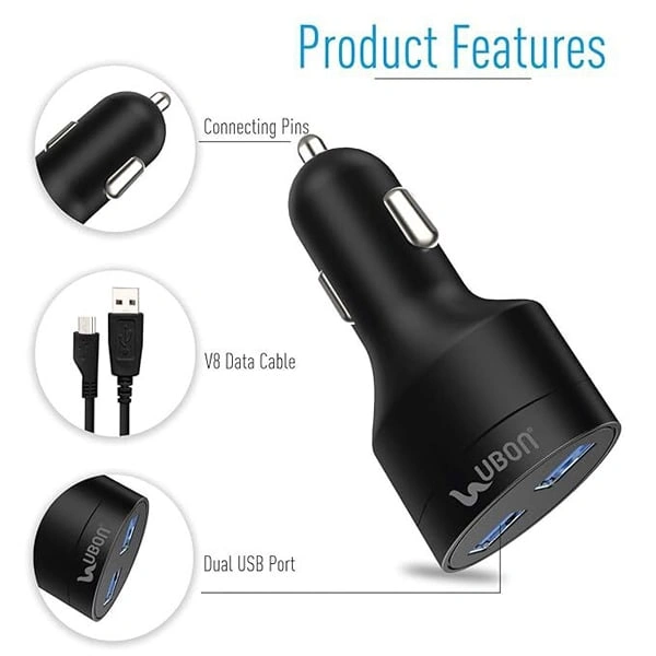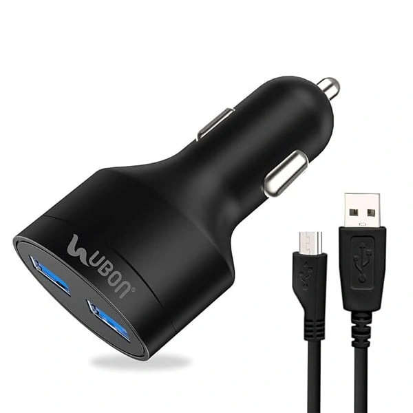 UBON CH-85 Boostcharge Dual USB Car Charger 2.4A 2 Fast Charging Port Charge Adapter with Micro USB Data Cable for Mobile Phone, Tablet & GPS (Black)