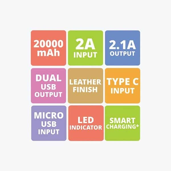 ZEB-MC20000 is a 20000mAH power bank that comes in a stylish leather finish. It comes with a Micro USB input and Dual USB output with a blue port for fast charging, an LED indicator and more.➦ Features