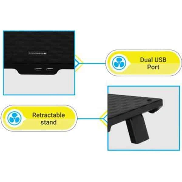 ZEB-NC3300 is a laptop cooling pad that comes with a sturdy build and a retractable stand making it easier to use your laptop for a longer period. The structure is built in a way that gives an optimized airflow as well. The laptop cooler has dual 120mm fans with Blue LED that come with a silent operation that helps you work in the quiet and help optimized airflow. The laptop cooler is powered by USB and comes with a dual USB port to help you become more efficient.